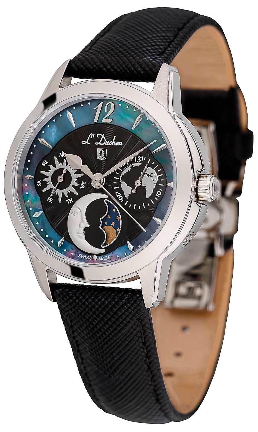 Наручные часы женские от L’Duchen- полюбившейся коллекции Celeste. На циферблате можно увидеть солнце и месяц, карту нашей планеты и кольцо из натурального перламутра. Выразительный аксессуар, дополненный необходимыми функциями, станет прекрасным продолжением стильного образа.