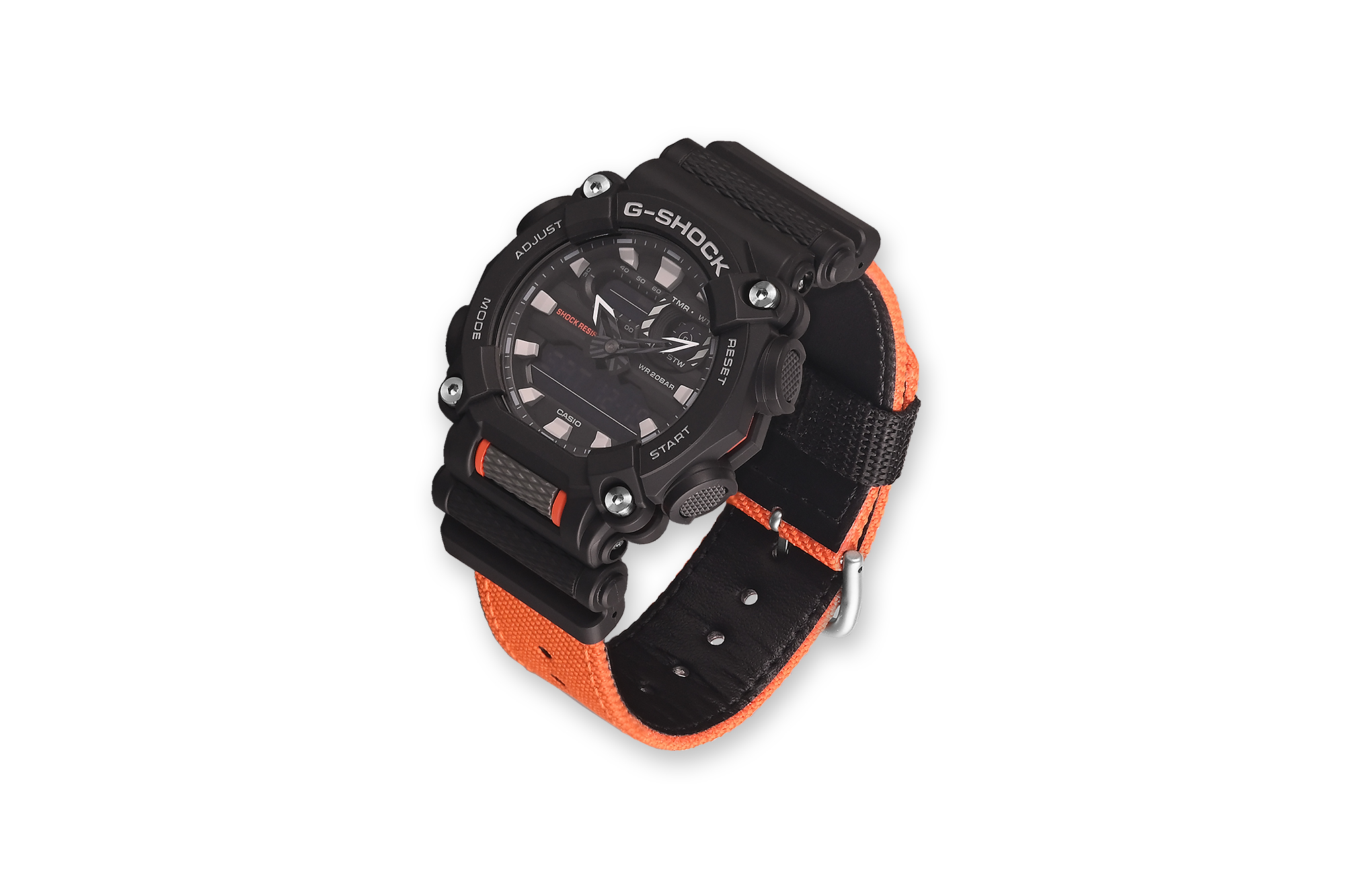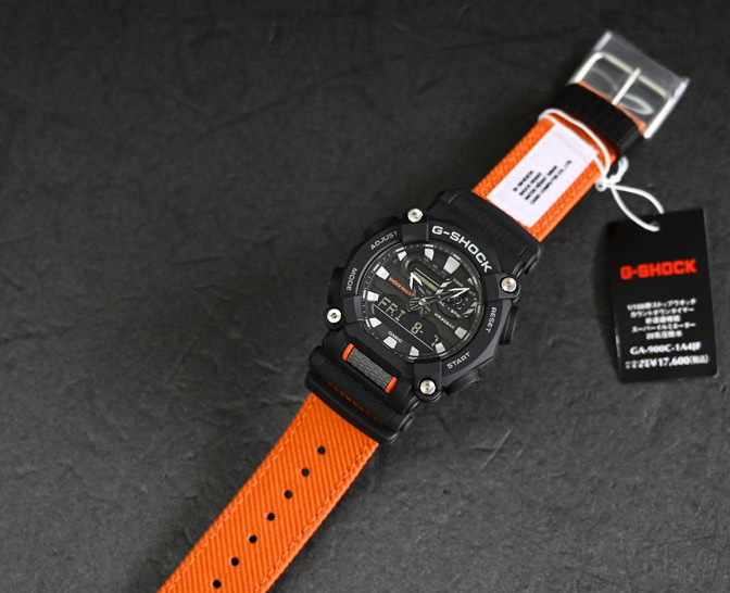 тканевый ремешок в GA-900A-1A4 контрастирует с серебристыми элементами