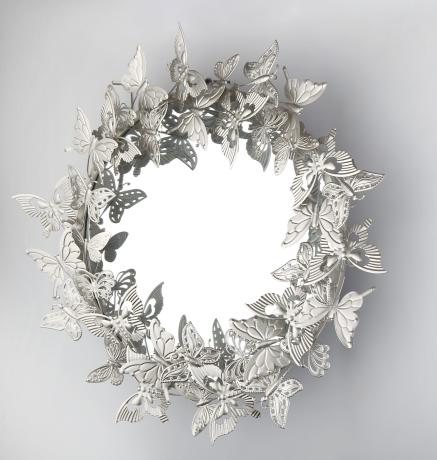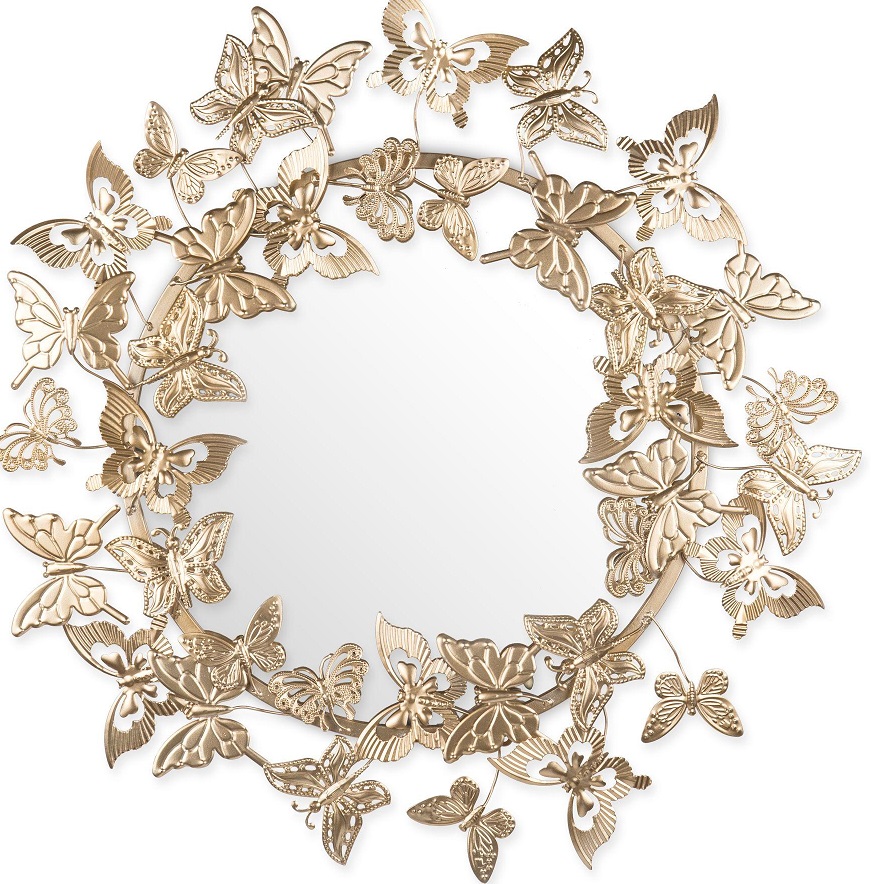 Декоративное настенное панно с зеркалом, изготовлено из металла с матовым золотистым покрытием. Обрамление представлено в виде множества бабочек, расположенных на разных уровнях. Диаметр зеркала 47 см