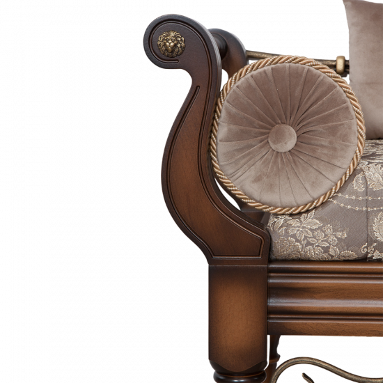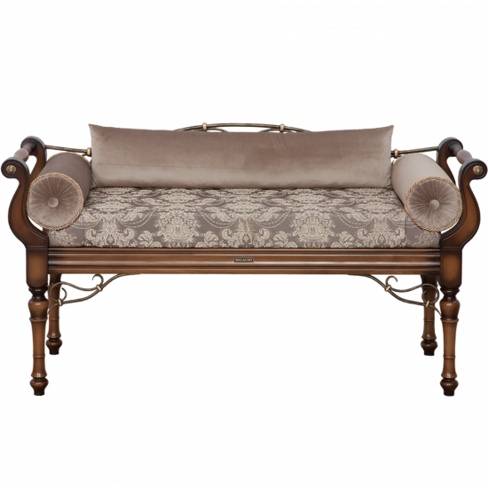 Грациозный вид изделию придают выточенные ножки, удобно выгнутые подлокотники, мягкое сиденье, подушки - валики по бокам. Каркас банкетки изготовлен из массива бука. Посадочное место, основа - мебельная фанера из берёзы.