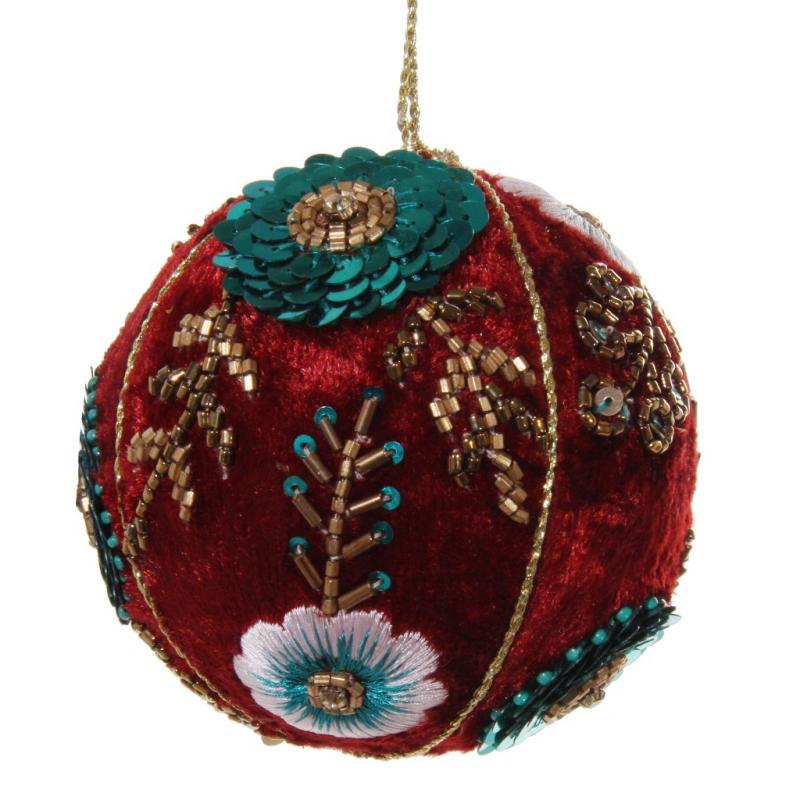 Изысканное украшение на Новый Год изготовлено из стекла ручной работы и декорировано бархатной тканью красного цвета.