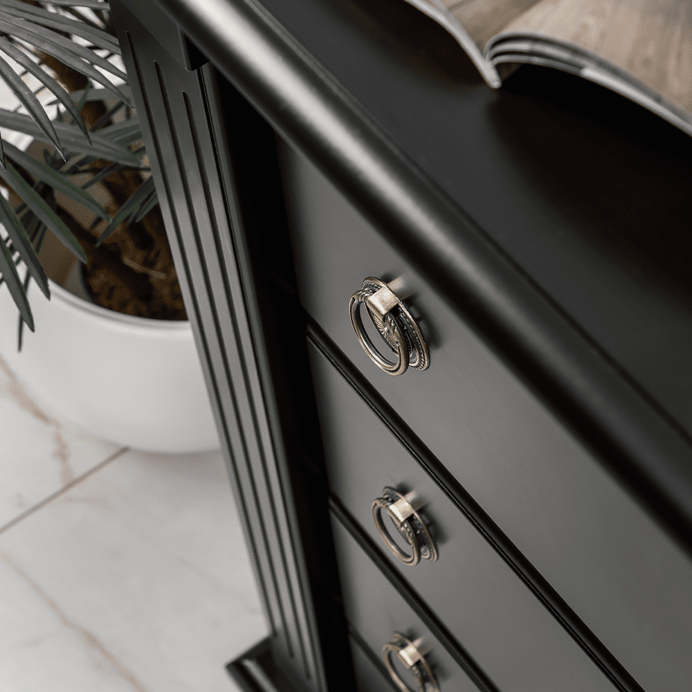 Капитель выполнена из МДФ. Фурнитура из латуни испанского производства. Накладки с имитацией каннелюров выполнены из массива бука и преставляют собой колонны. Каркас и основание изготовлено из МДФ.