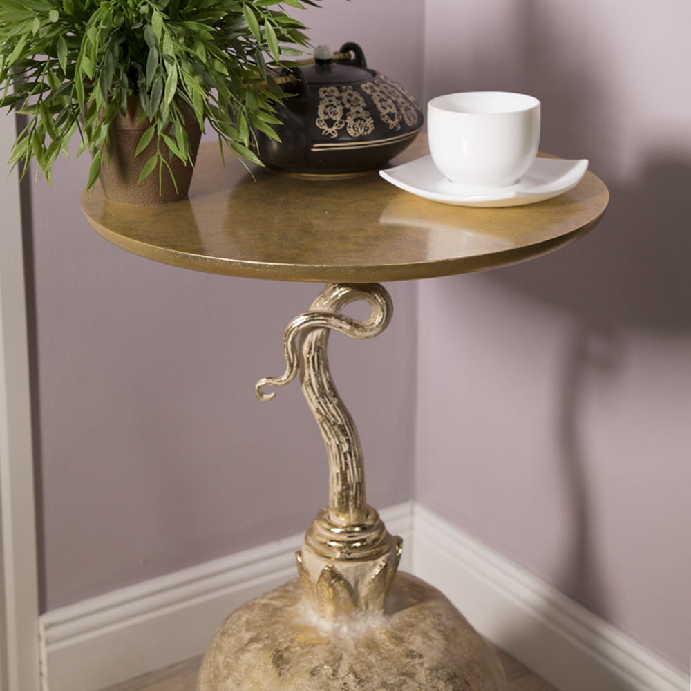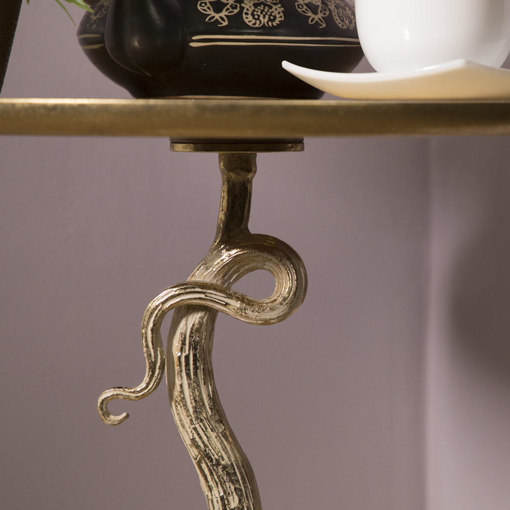 Журнальный кофейный столик BOGACHO Жемчужный Гранат золотой со столешницей из дерева и основанием из кованой стали и стеклокомпозита (ручная работа).