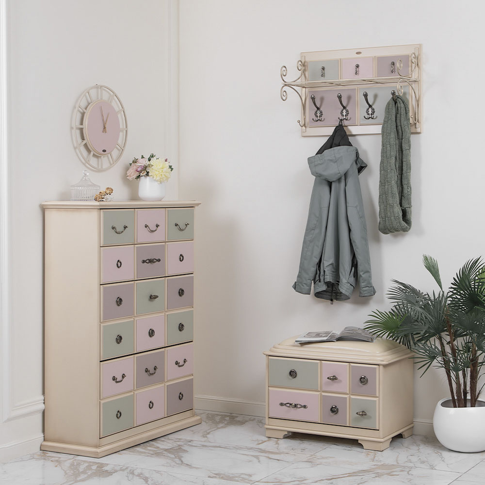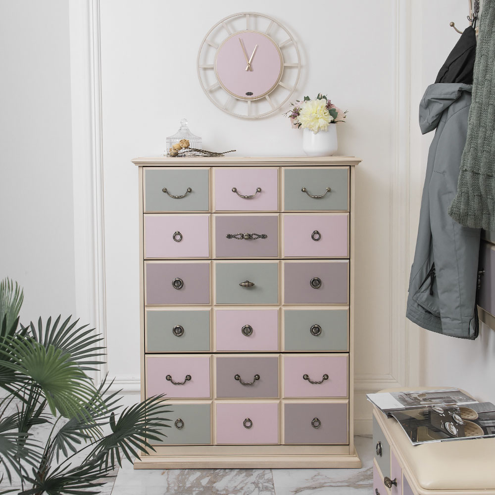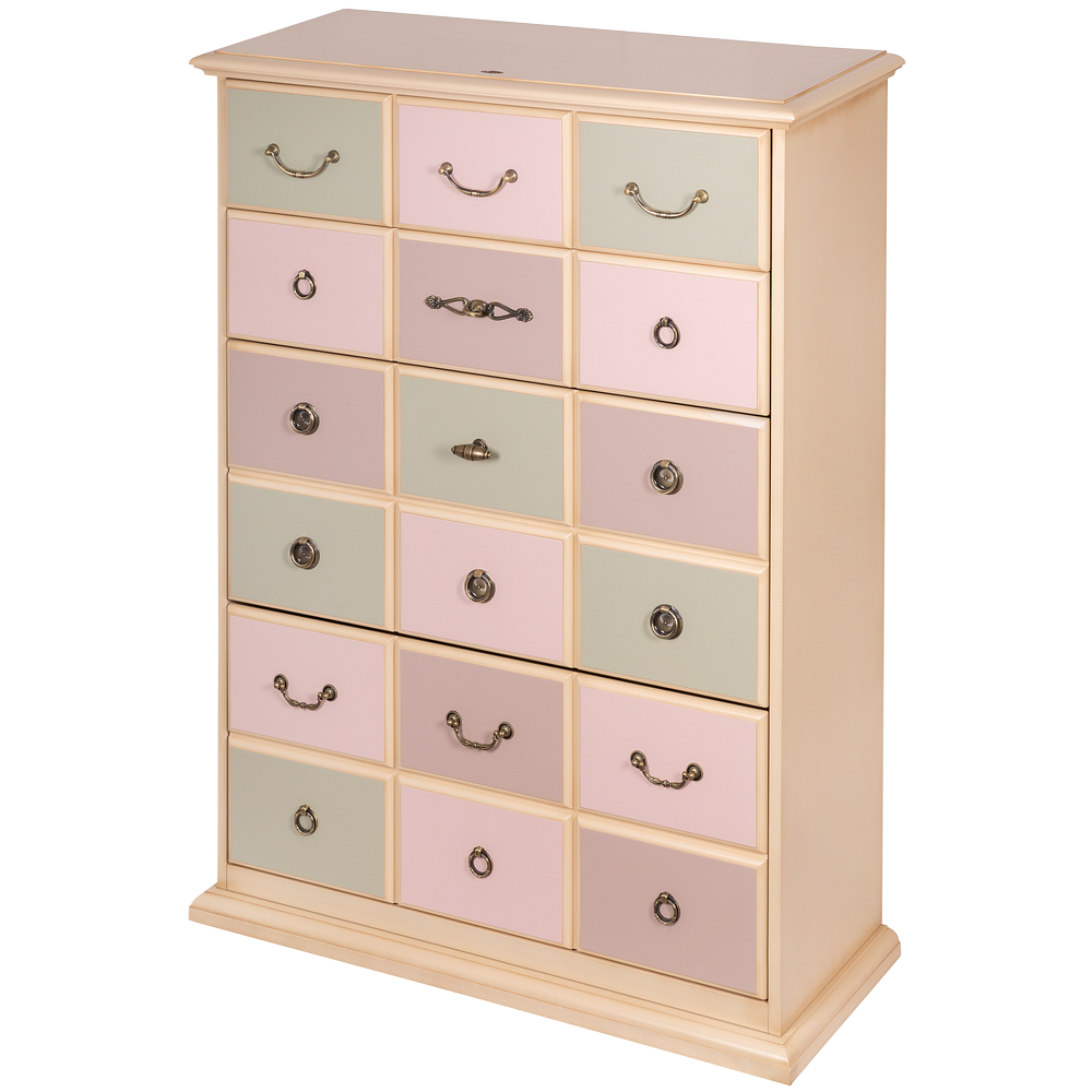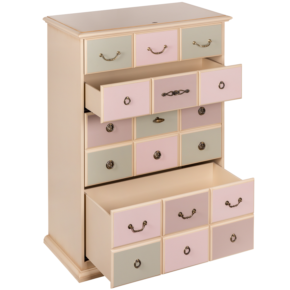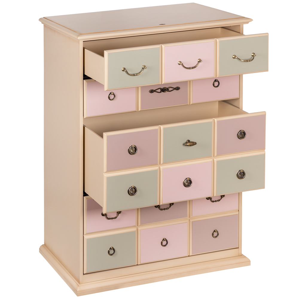 Каркас комода и ящики выполнены из МДФ. Поверхность тонирована, патинирована и покрыта лаком. Ящики выполнены из МДФ и окрашены в синий, белый и красный цвета. Фурнитура из латуни испанского производства.