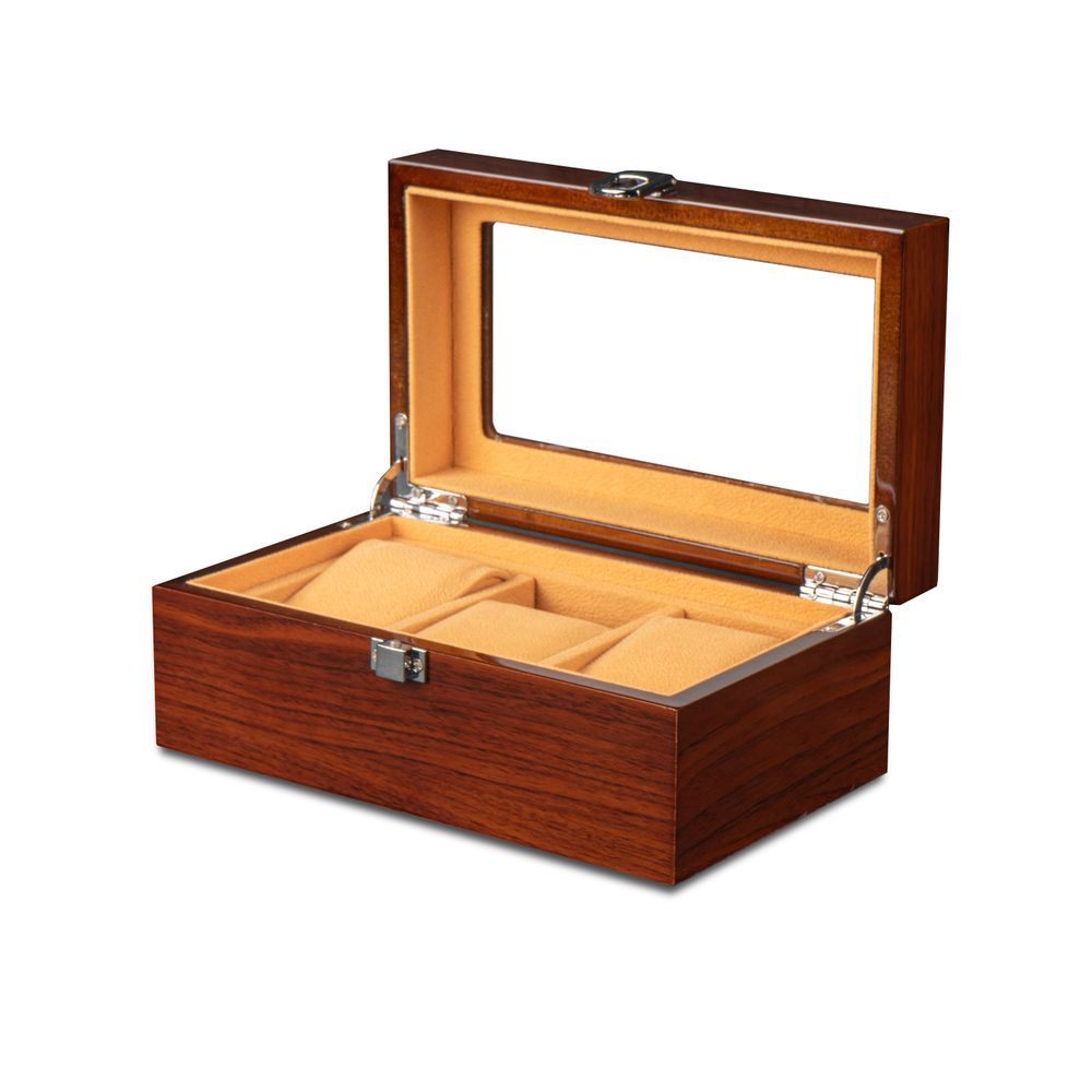 Исполнение в коричневом дереве с бежевым интерьером является потрясающим сочетанием, которое выбирает большое количество людей для хранения своих элегантных часов. Удобные и мягкие подушки позволят с максимальным комфортом застегнуть на них любые 3-е часов с разными диаметрами. Верхняя крышка шкатулки плотно закрывается на замок, выполненный из высококачественного металла.