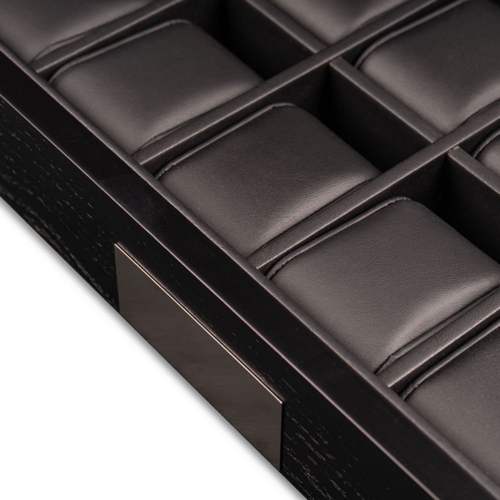 Для ценителей своих наручных аксессуаров мы расположили прозрачное стекло посередине крышки, через которое можно созерцать коллекцию из 12-ти часов. Исполнение экстерьера в черном дереве Бубинга является редкостью, а покрытие множественными слоями высококачественного лака придает изящность.