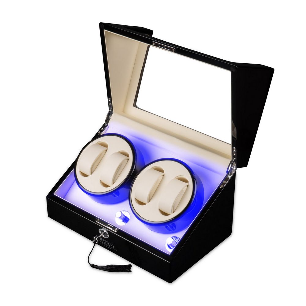 В экстерьере используется дерево, покрытое множественными слоями высококачественного глянцевого лака черного цвета. Для максимальной простоты в использовании автоподзавод включается всего с одной кнопки на задней стороне бокса. Истинные ценители часов оценят четыре режима подзавода в шкатулке, управляемые на торцевой части рядом с крутящимся кольцом. Продуманная система выбора режимов вращения сможет завести любые часы любой сложности. Достаточно просто повернуть тумблер на нужный режим, и часы будут автоматически подзаводиться. Для ночной видимости часов, в шкатулке встроена приятная светло-синяя светодиодная подсветка под кольцом подзавода, включающаяся с кнопки на задней стороне.