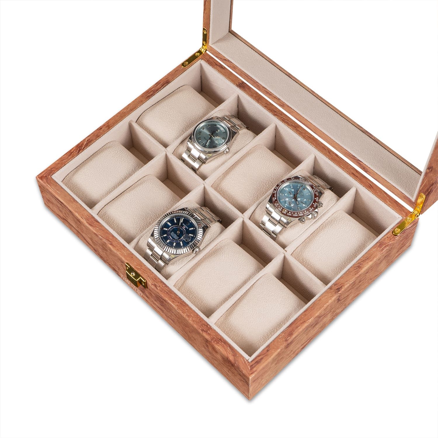 Исполнение в темно-розовом дереве с бежевым интерьером является потрясающим сочетанием, которое выбирает большое количество людей для хранения своих элегантных часов. Удобные и мягкие подушки позволят с максимальным комфортом застегнуть на них любые 10 часов с разными диаметрами. Верхняя крышка шкатулки плотно закрывается на замок, выполненный из высококачественного металла.