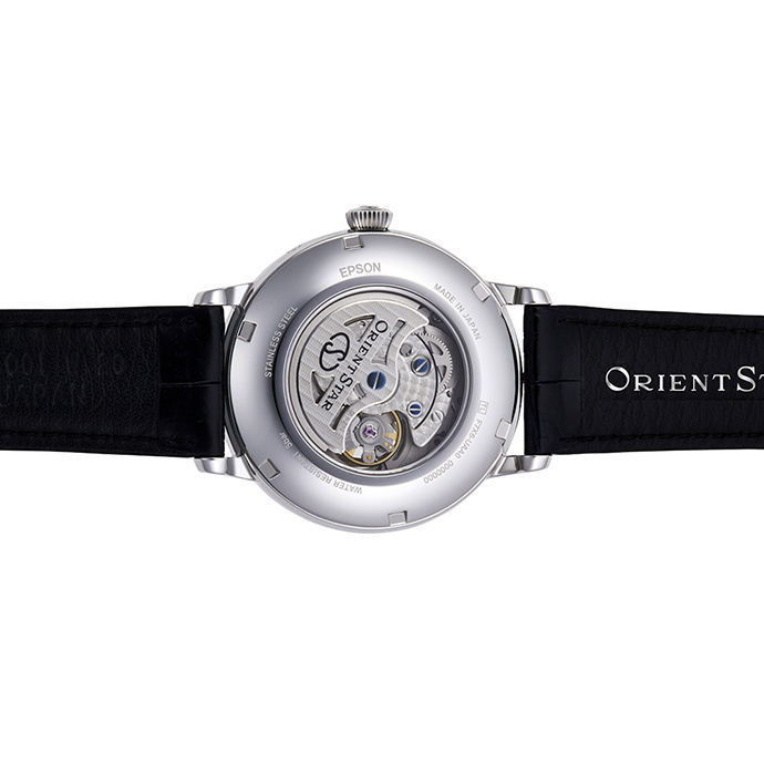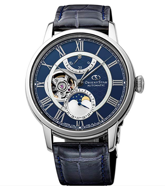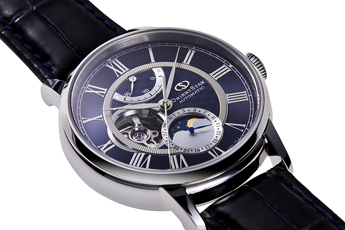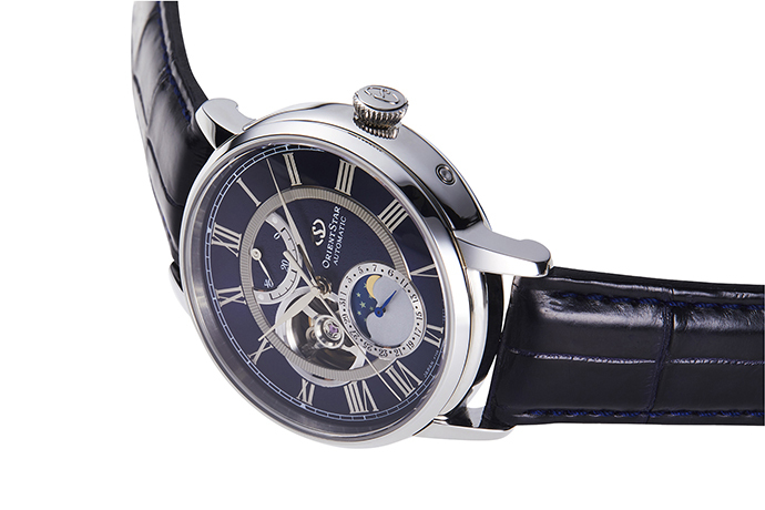 Новые механические часы ORIENT STAR диаметром 41 мм отличаются ярким оригинальным дизайном и великолепным качеством исполнения. Модель выполнена в привлекательном корпусе из нержавеющей стали в сочетании с ремешком из крокодиловой кожи ручной работы и безупречно проработанным синим циферблатом. Уникальный опыт и экспертиза японских часовых мастеров Orient позволили воплотить в этой модели редкое сочетание функций в одном корпусе: индикатор запаса хода, индикатор открытого баланса для наблюдения за работой механизма и индикатор фаз луны. Вручную изогнутые стрелки подчеркивают изысканную эстетичность модели. Дизайн оригинального диска индикации фаз луны, окаймленного шкалой дат, специально разработан, чтобы гармонировать с темно-синим ночным небом и мягким лунным светом. Яркую эстетику модели дополняют часовые метки с римскими цифрами, индикатор запаса хода 40 часов, прозрачная задняя крышка из сапфирового стекла и заводная головка с фирменной монограммой Orient Star и функцией автоподзавода. Часы оснащены сап