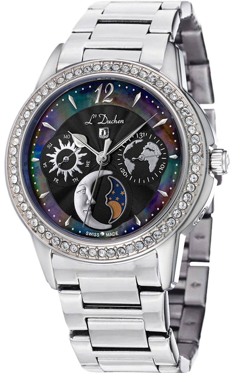 Наручные часы женские от L’Duchen- полюбившейся коллекции Celeste. На циферблате можно увидеть солнце и месяц, карту нашей планеты и кольцо из натурального перламутра. Выразительный аксессуар, дополненный необходимыми функциями, станет прекрасным продолжением стильного образа.