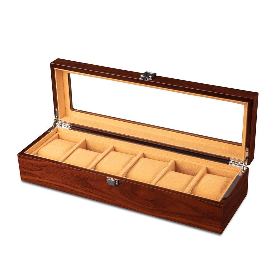 Исполнение в коричневом дереве с бежевым интерьером является потрясающим сочетанием, которое выбирает большое количество людей для хранения своих элегантных часов. Удобные и мягкие подушки позволят с максимальным комфортом застегнуть на них любые 3-е часов с разными диаметрами. Верхняя крышка шкатулки плотно закрывается на замок, выполненный из высококачественного металла.