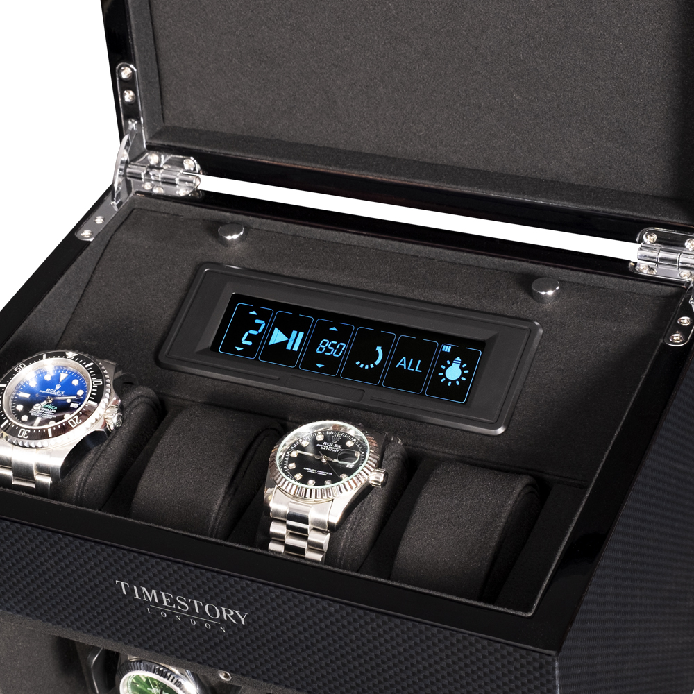 В экстерьере используется высококачественный карбон, покрытый большим количеством слоев глянцевого лака.Профессиональная система выбора режимов вращения сможет завести любые часы любой сложности. Достаточно просто на сенсорном экране подобрать нужное количество оборотов (от 300 до 2300), выбрать подходящее вращение (по часовой / против часовой стрелки или попеременное вращение) . Использование мягкой ткани черного оттенка в интерьере не оставит вас равнодушными. Телескопические держатели позволят с максимальным комфортом и удобством застегнуть на них часы с любой длиной ремешка или браслета.