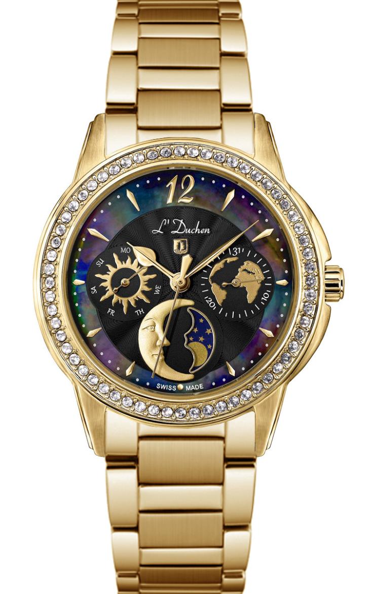 Наручные часы женские от L’Duchen- полюбившейся коллекции Celeste. На циферблате можно увидеть солнце и месяц, карту нашей планеты и кольцо из натурального перламутра. Выразительный аксессуар, дополненный необходимыми функциями, станет прекрасным продолжением стильного образа.