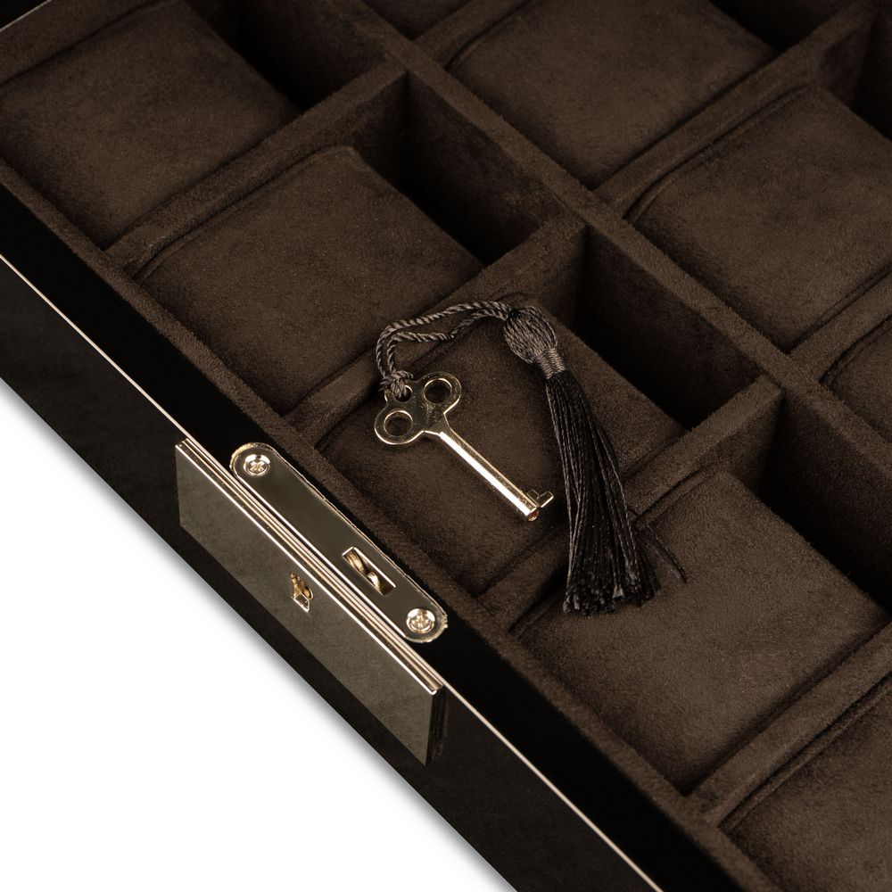 Демонстрируя свои часы, нужно не забывать про их сохранность. Обеспечить ее позволяет небольшой замочек на торцевой части, закрывающийся на ключ.