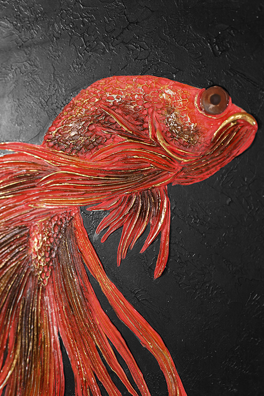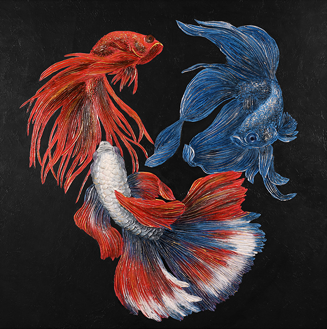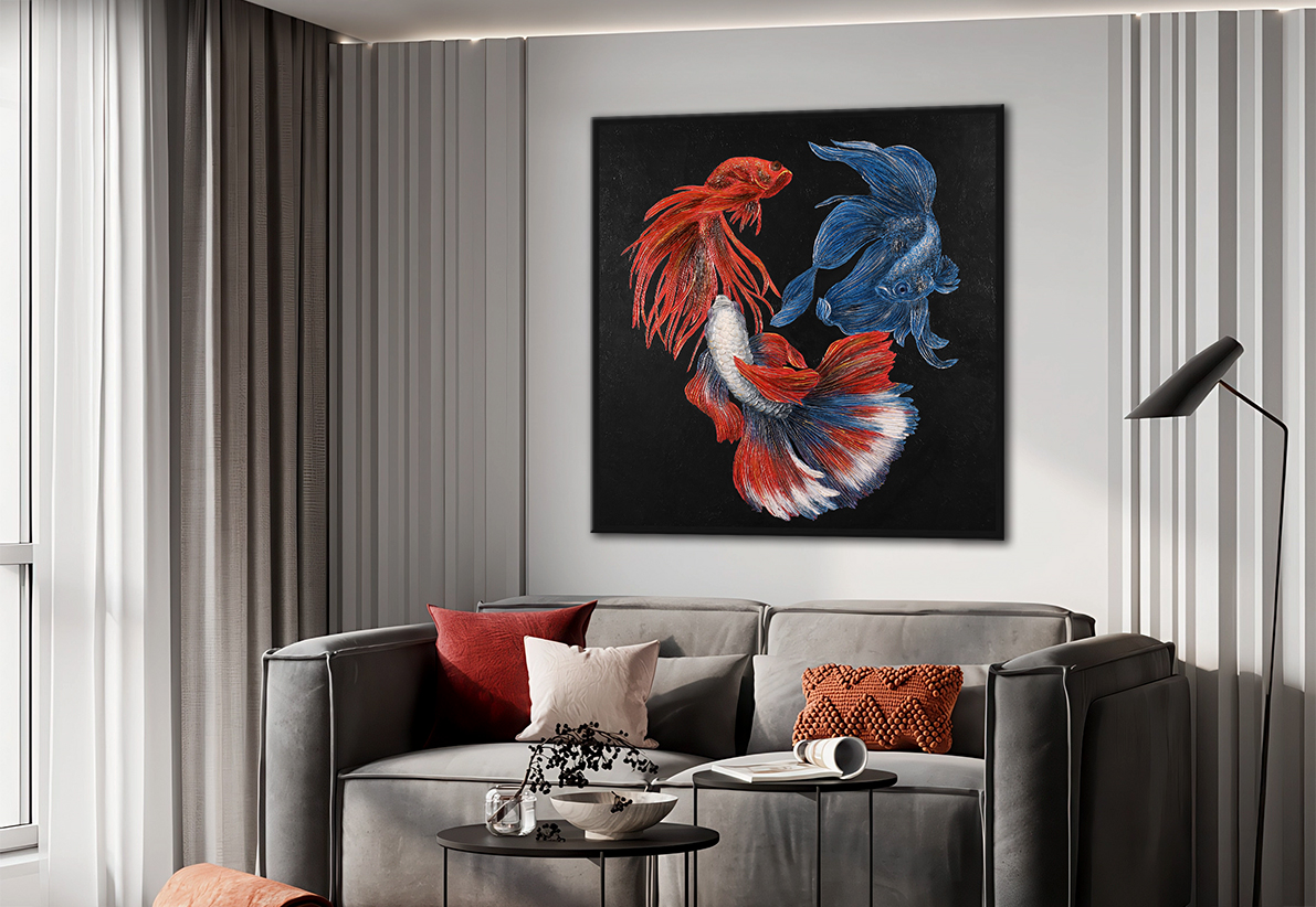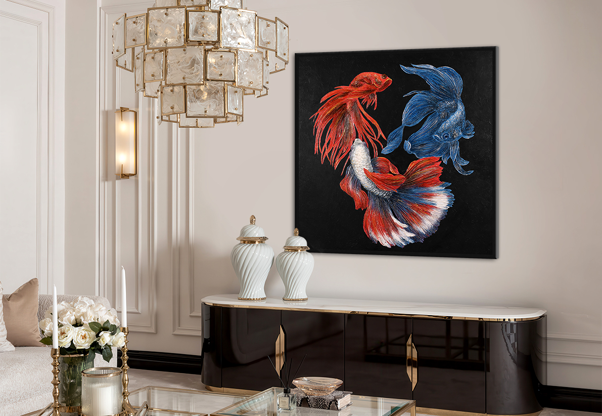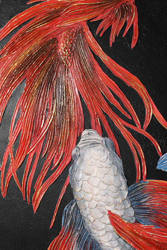 Далее поверх принта художники наносят объемный декор, используя декоративную штукатурку, премиальные материалы. Каждый элемент декора прорабатывается с высокой детализацией, создавая трехмерный эффект. В данной коллекции художники применяют собственные разработки нанесения декора, что позволяет картине стать уникальной.